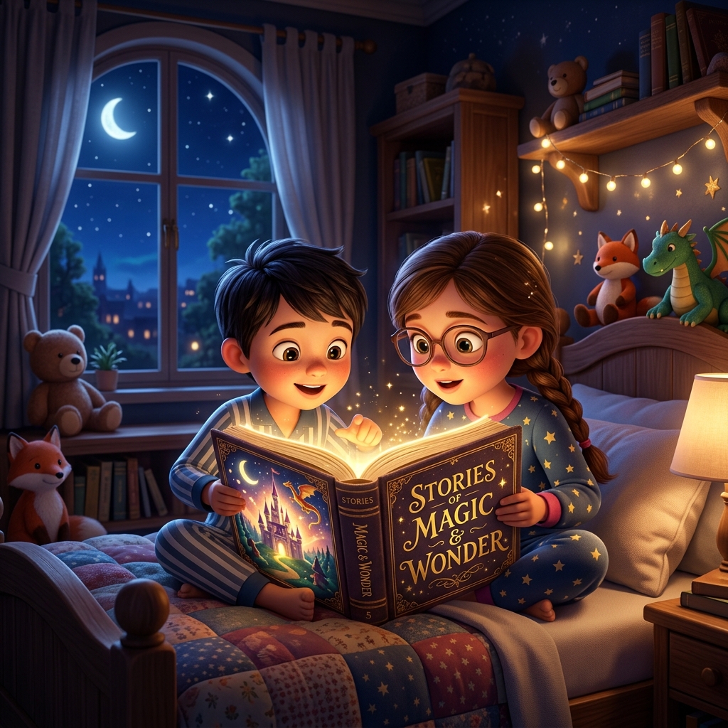 Jede Gute-Nacht-Geschichte kommt atemberaubende, maßgeschneiderte Kunstwerke, die in Echtzeit für jede Szene erstellt werden und die Geschichte deines Kindes zum Leben erwecken.